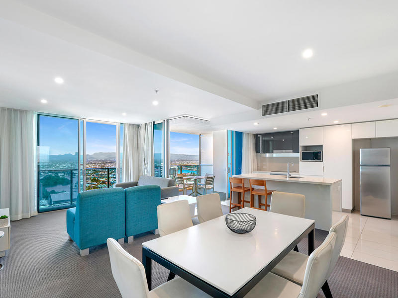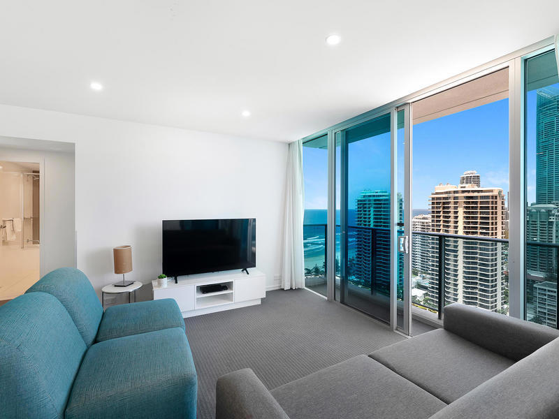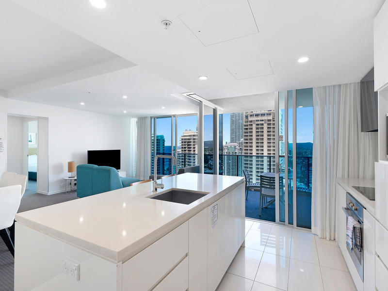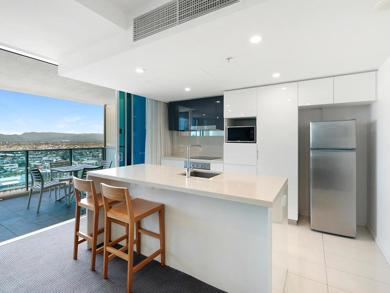 Located on the 23rd level this 2 bedroom 2 bathroom apartment has floor to ceiling glass windows to enjoy views of the ocean, city and hinterland. The oversized dream house sized kitchen features stone benchtops with breakfast bar and stainless steel appliances and looks out over the large living, dining and balcony areas. The south east facing balcony has some of the best views available, this apartment is guaranteed to impress.